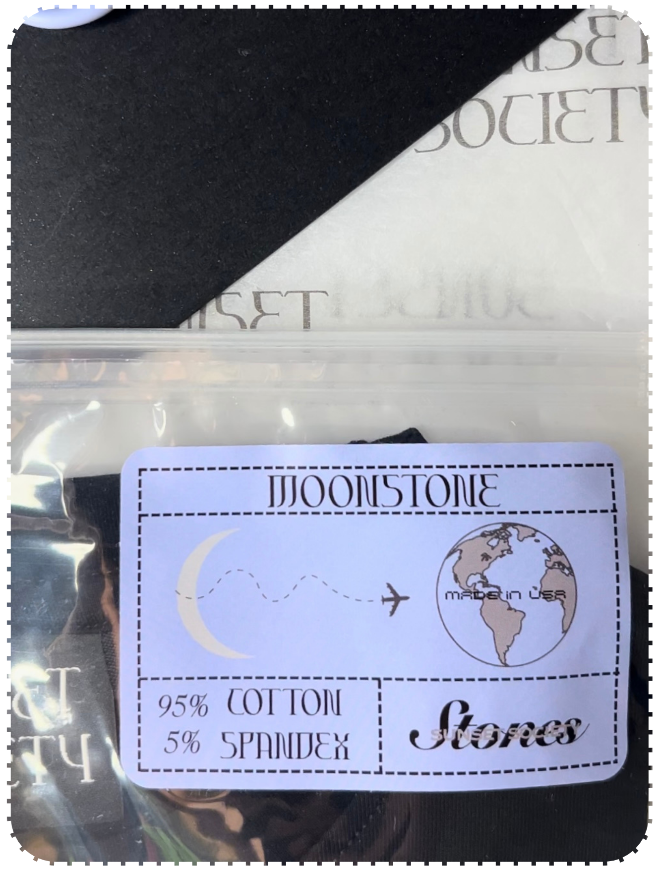 Next, I made measurements, selected colors, and chose materials. Once every thing was ready, I began ordering samples. While awaiting their arrival, I started designing packaging, which I made this moonstone for. But, I thought it would look good on a shirt.
